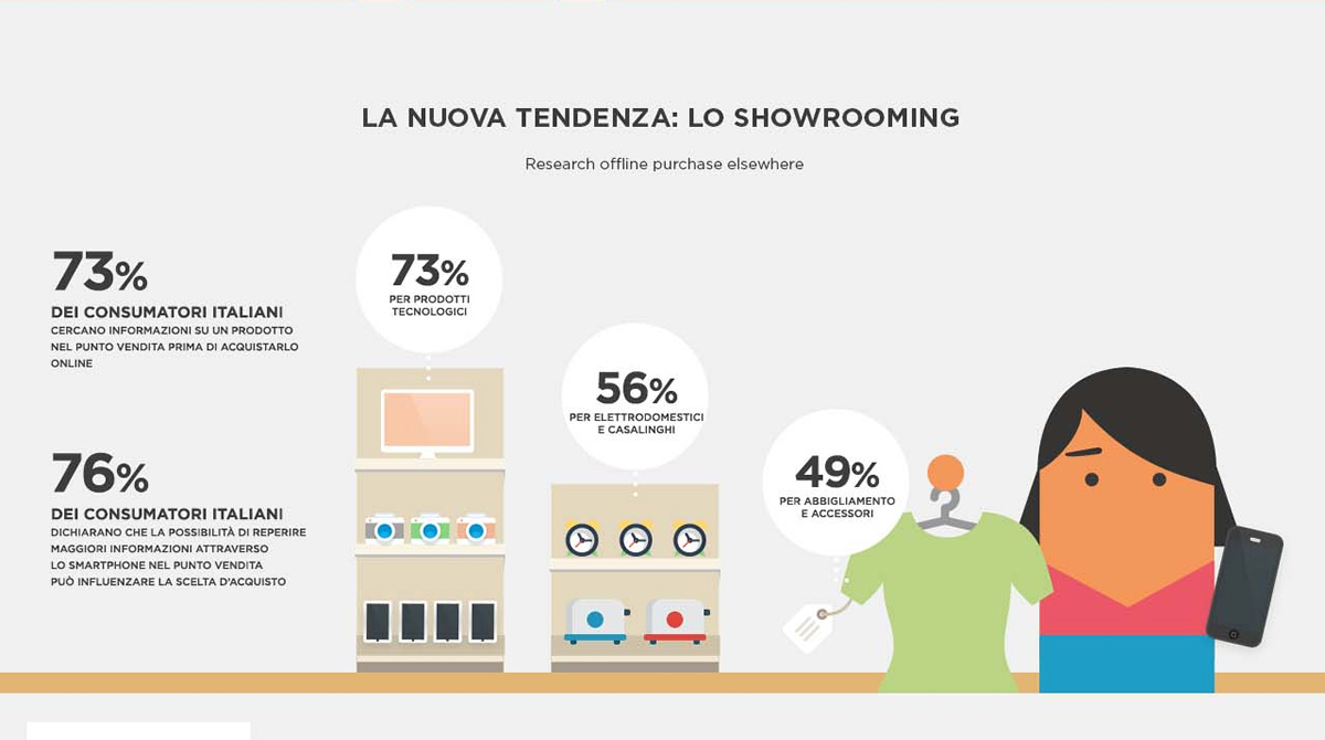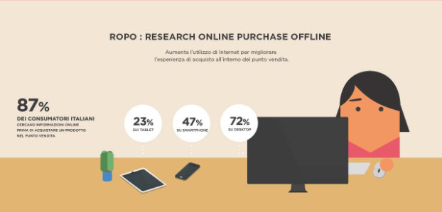 Wired, il magazine noto come “la Bibbia di Internet”, lo chiama Connected Commerce e ne celebra la nascita con un pezzo dedicato alla ricerca “Connected Commerce: A Snapshot of the Modern Shopper”, condotta dall’agenzia internazionale di marketing e tecnologia DigitasLBi in 12 Paesi (USA, Cina ed Europa, Italia compresa): 1.000 consumatori per nazione, monitorati nelle proprie abitudini di acquisto tra febbraio e marzo 2014. “Smartphone e tablet stanno rendendo sempre più labili i confini tra lo shopping tradizionale e l’eCommerce”, afferma Carol Pesenti, Head of Italy in DigitasLBi. “Se da un paio d’anni si è diffusa tra i consumatori la tendenza ROPO Research Online Purchase Offline (ci si documenta in rete su un prodotto prima di acquistarlo fisicamente in negozio, vedasi immagine sopra a destra), ora si assiste alla nascita del fenomeno inverso, lo Showrooming ovvero