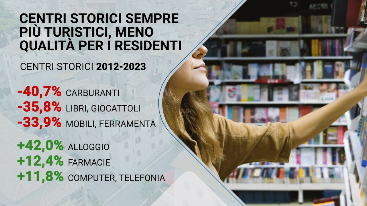 Però, c’è chi scende e c’è chi sale. Nei centri storici sono sempre meno le attività tradizionali (carburanti -40,7%, libri e giocattoli -35,8%, mobili e ferramenta -33,9%, abbigliamento -25,5%) e sempre più quelle che offrono servizi e tecnologia (farmacie +12,4%, computer e telefonia +11,8%), oltre alle attività di alloggio (+42%) e ristorazione (+ 2,3%), aumentate queste di quasi 10mila unità tra il 2012 e il 2023, grazie soprattutto alla crescita esponenziale dei bed & breakfast: +168% nei centri storici del Sud e +87% in quelli del Centro-Nord. Esprimo forte scetticismo che quei B&B siano effettivamente tali, perché a invadere i centri storici sono le locazioni brevi promosse da piattaforme come Airbnb et similia, causa spesso scatenante overtourism e turismo di massa.