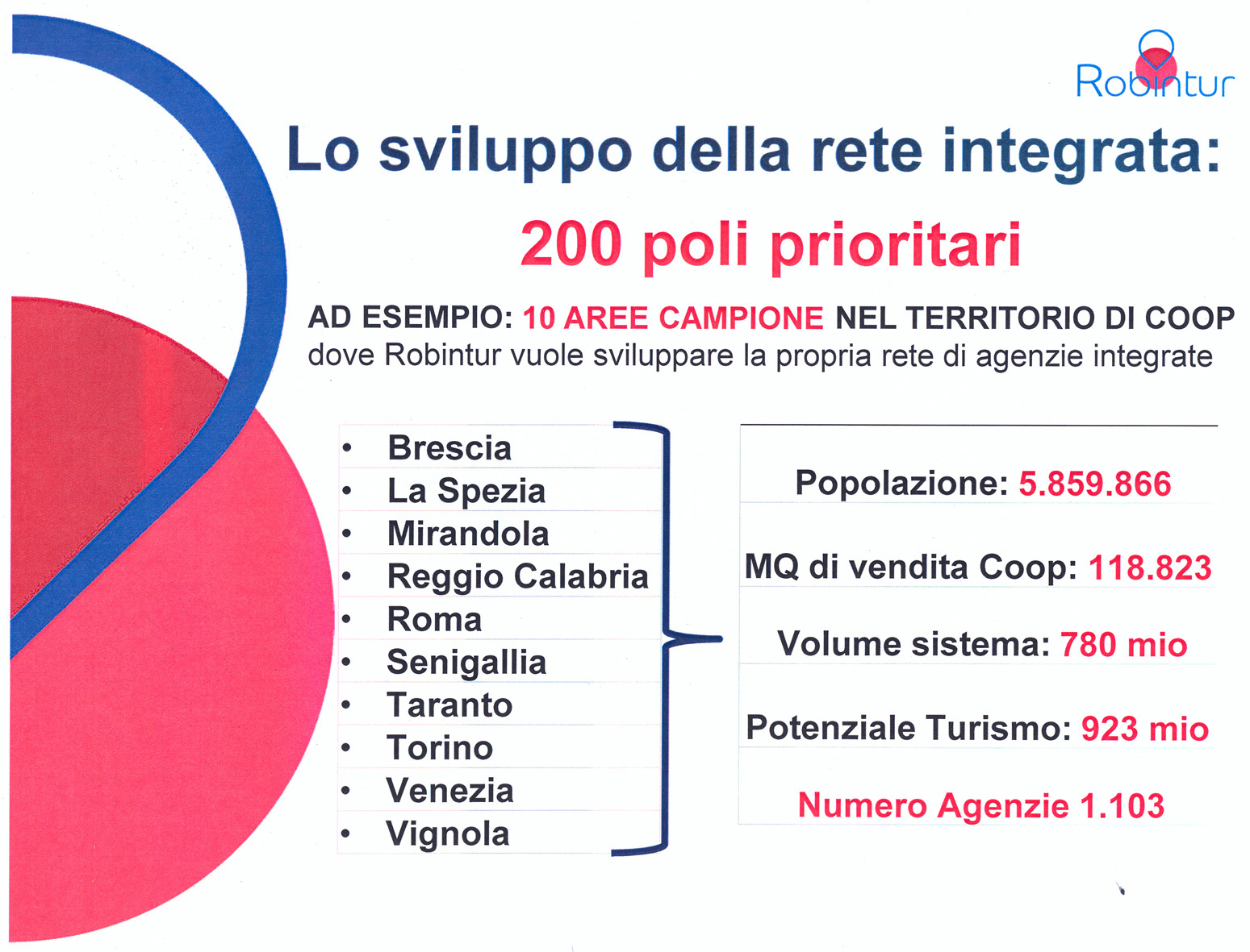È una “rete integrata” il progetto della “nuova” Robintur guidata dal direttore generale Claudio Passuti, che al TTG Incontri 2017 ha aggiornato il piano industriale presentato ad aprile a Milano. Partendo dalle attuali 284 agenzie di viaggi (delle quali 90 di proprietà, con insegna Robintur e Viaggi Coop, e dopo il termine della decennale partnership con GPT Gruppo Professione Vacanze) l’obiettivo del piano triennale è raggiungere le 500, sia dirette che affiliate su tutto il territorio italiano. Tre le formule di partnership proposte (Classic Partner, Main Partner e Full Partner) con gradi diversi di esclusiva e integrazione con la rete. Per il 2018 il network bolognese punta ad affiliare 70 nuove agenzie, soprattutto con la formula Main Partner, grazie alla controllata Via con Noi Srl, fondata nel 2006 a Napoli e da sempre guidata dal presidente Beppe Ambrosino. Sviluppo che coprirà innanzitutto i territori dove Coop è presente con uno dei suoi quasi 1.200 supermercati, a cominciare da 200 poli prioritari identificati grazie a criteri di geo-marketing (vedasi tabella a destra).